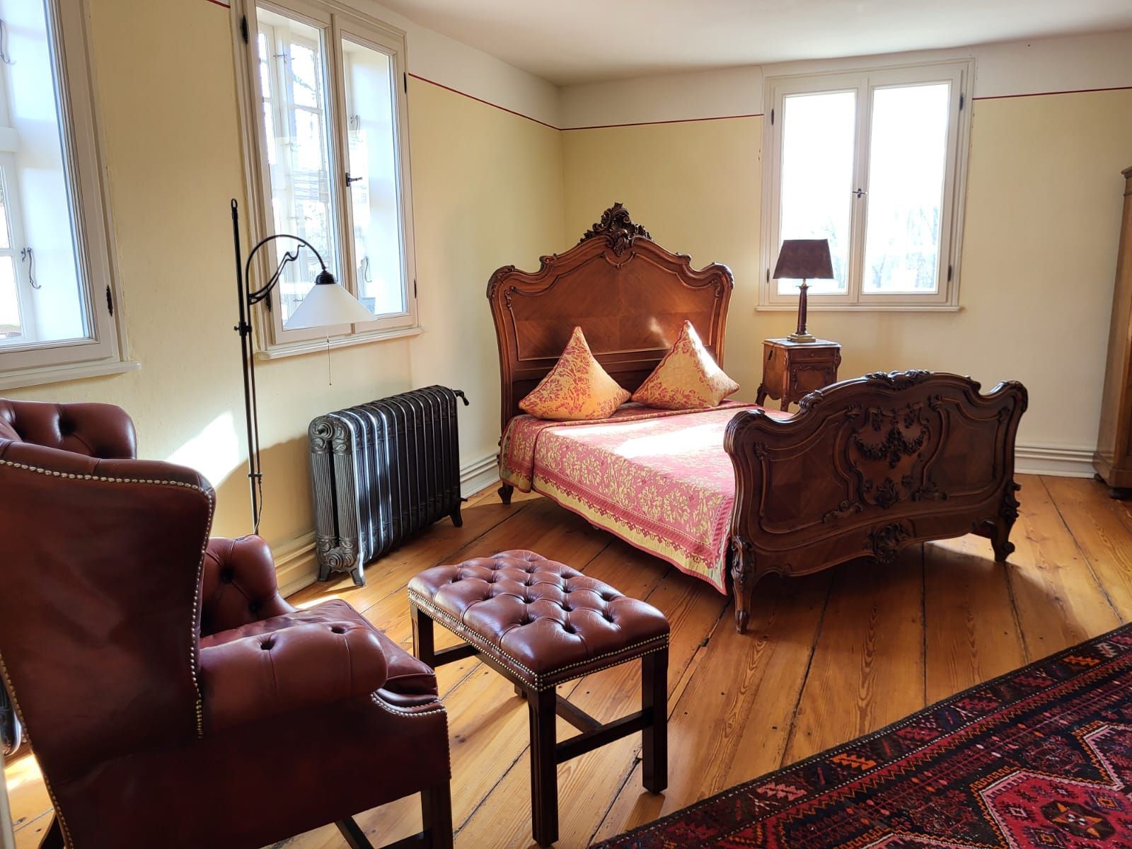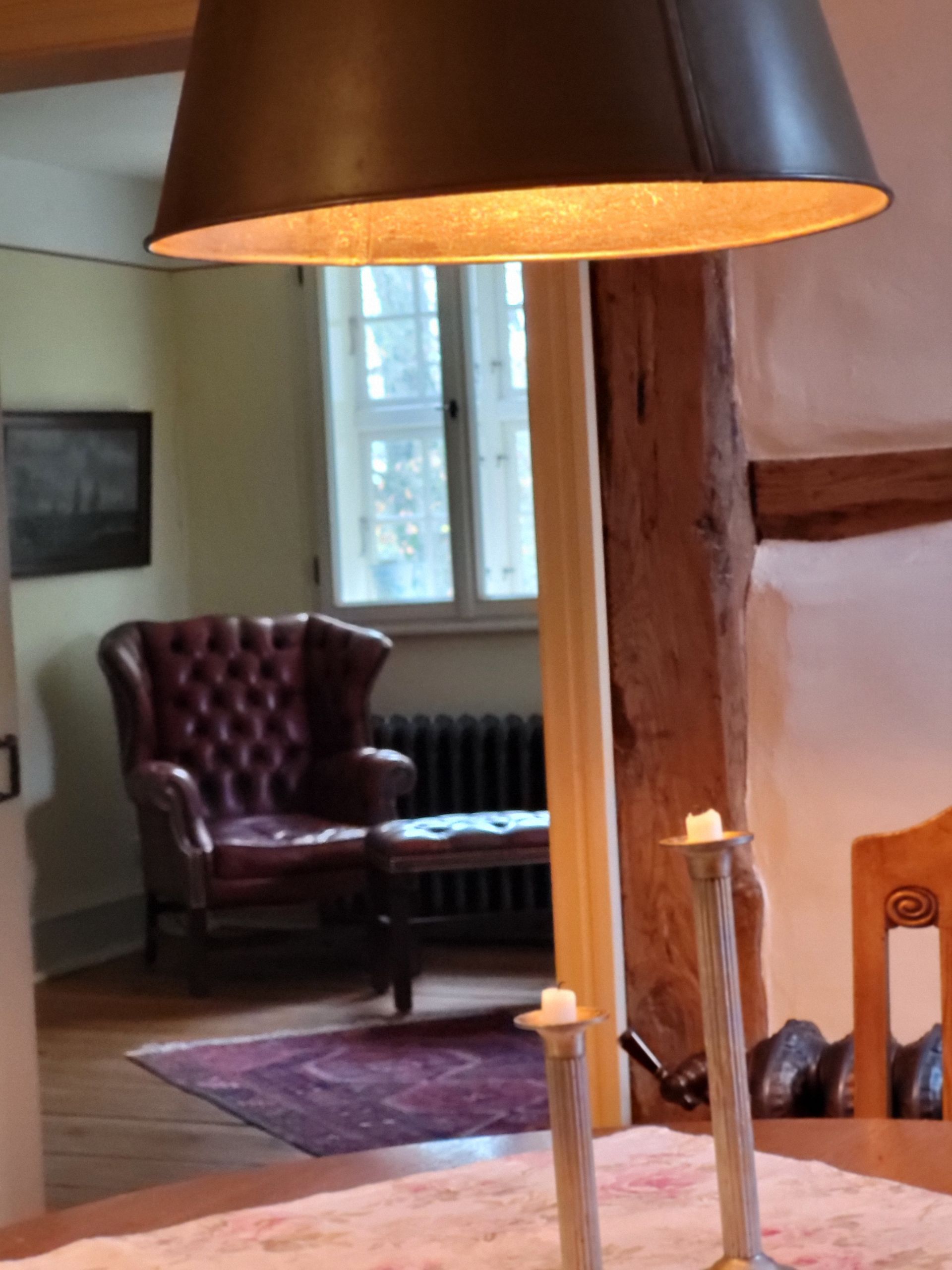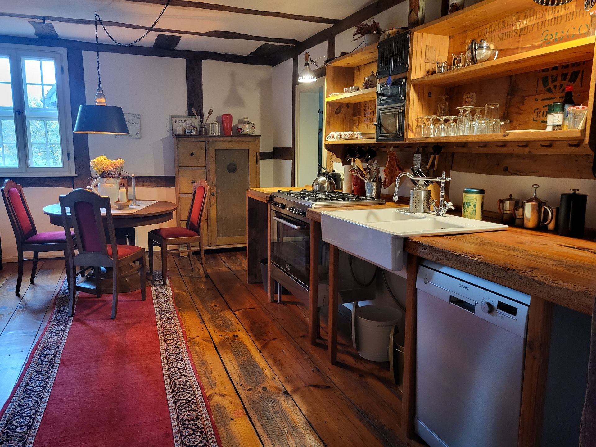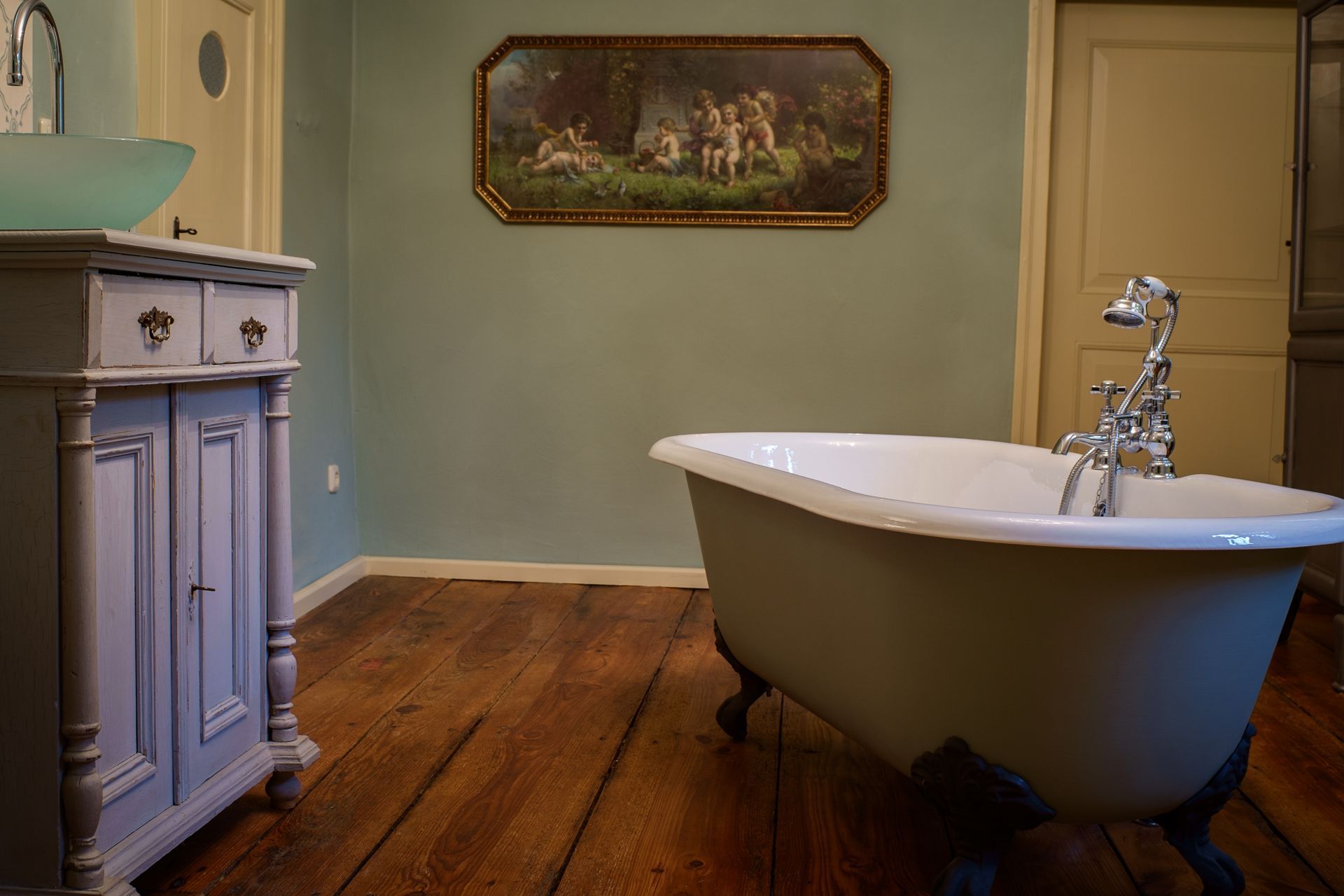 Die Flamen-Wohnung liegt überwiegend rondellseitig und zeichnet sich durch die gemütliche Wohnküche für bis zu 4 Personen und das luxuriöse Nostalgie-Bad mit einer freistehenden gusseisernen Badewanne mit Blick auf den Gutspark und einem Bidet aus. Daneben findet sich die klassische Wohnstube mit einem sonnenverwöhnten Südfenster und einem französischen Doppelbett. Das Schlafzimmer mit einem großen Doppelbett ist sowohl vom Wohnzimmer als auch direkt von der Oberdiele aus zu erreichen. Die Wohnung eignet sich auch für große Gäste (Überlängen der Betten mit 220cm, extra hohe Dusche, WC und Waschbecken sowie Küchenzeile).